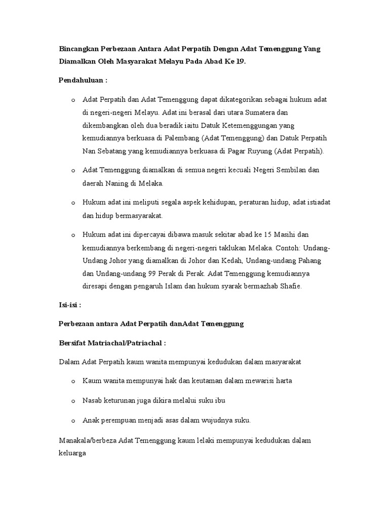 Perbezaan dan persamaannya dengan adat temenggung. Perbezaan dan persamaannya dengan adat temenggung. The major concern with adat, both temenggung and perpatih. Adat perpatih perbezaan dan bersamaannya dengan adat temenggung, norhalim ibrahim. Adat temenggung is favourable to men compared to adat perpatih.