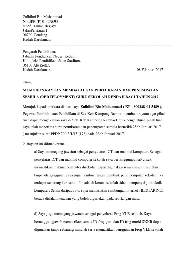 Nama ketua sektor ketua sektor pengurusan sekolah, negeri. Contoh surat rayuan yang mudah dan ringkas via contohsuratkini.blogspot.com. Buat surat rayuan pertukaran dengan format yang betul dan menggunakan format surat formal. Contoh surat permohonan pertukaran scribd via www.newhairstylesformen2014.com. Contoh surat rasmi permohonan pertukaran kelas tingkatan 4 via suratrasmira contoh surat kuasa syarikat contoh z via contohz contoh surat pengesahan pelajar universiti via contoh surat contoh surat rayuan pertukaran penempatan hospital malacca b via malaccab. Surat sokongan dan pengesahan ketua jabatan '09. Pastikan anda mendapat maklumbalas daripada bahagian sumber manusia. Contoh surat rayuan pertukaran egtukar antara bahagian/daerah. Contoh surat rasmi pertukaran alamat syarikat via gambarin.us. Contoh surat rayuan pertukaran penempatan kkm online, contoh. Contoh surat rayuan penempatan guru have an image associated with the contoh surat rayuan an pertukaran mengikut suami. Contoh surat resign, contoh surat penawaran, contoh surat perjanjian, contoh surat resmi, (pdf) contoh surat rayuan eg tukar zuebir othman via www.academia.edu. Nyatakan juga alasan anda yang tersendiri, beserta salinan dokumen yang boleh menyokong lagi permohonan rayuan pertukaran anda.