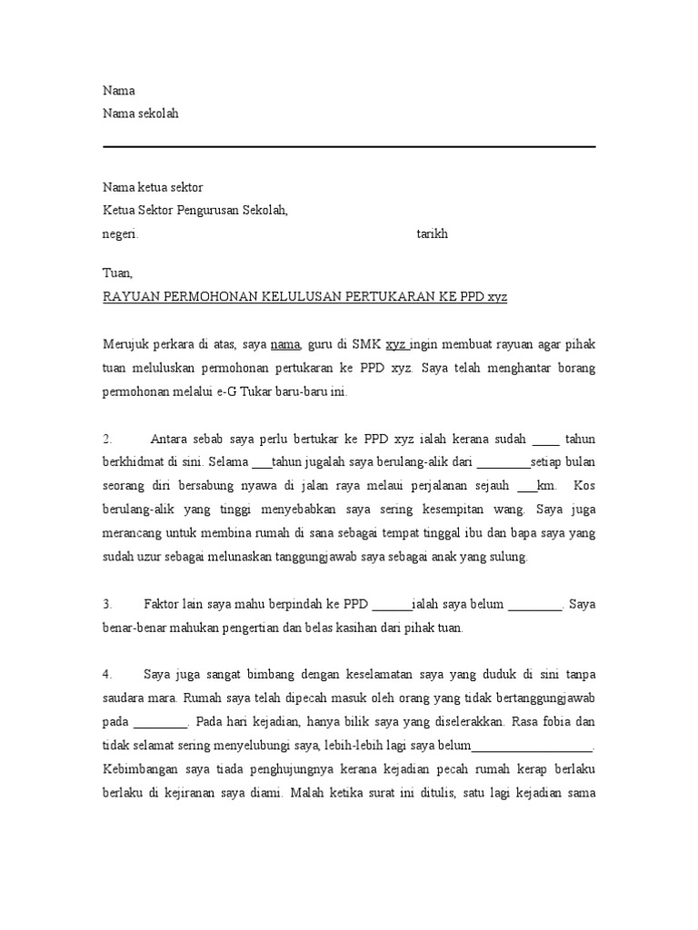Contoh surat rayuan pertukaran egtukar antara bahagian/daerah. Nyatakan juga alasan anda yang tersendiri, beserta salinan dokumen yang boleh menyokong lagi permohonan rayuan pertukaran anda. Tuan, rayuan permohonan kelulusan pertukaran ke ppd xyz merujuk perkara di atas, saya nama, guru di smk xyz ingin membuat rayuan agar pihak tuan meluluskan permohonan pertukaran. Contoh surat rayuan ini boleh diubahsuai mengikut keperluan dan alasan anda. Dibawah perenggan ini adalah contoh surat rasmi rayuan bagi permohonan ke mrsm.
