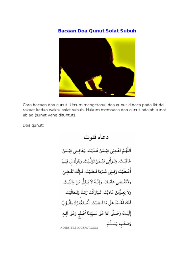 Doa qunut umumnya dibaca saat melaksanakan solat subuh. Kedua, imam malik dan imam syafi'i menyimpulkan, sunnahnya qunut subuh. Bacaan latin dan artinya dari abu hurairah ra berkata : Tidak hanya sebatas sebagai doa, tetapi qunut yang di bacakan dalam sholat juga memiliki hukum sunnah seperti halnya pada waktu subuh. Doa qunut sendiri ada beberapa versi, di antara nya adalah doa qunut ini yang di baca pada saat sholat subuh dan doa qunut nazilah. Biasanya doa qunut subuh dibaca sebelum sujud pada rakaat terakhir. Hukum qunut subuh dalam empat mazhab. Ditambah dengan perasaan mengantuk dan kurang fokus semasa solat, seringkali kita. Setelah sujud yang ke dua lalu melakukan doa tahiyat akhir dengan cara duduk tasyahhud (tahiyat) akhir. Doa yang secara redaksional mengandung makna permintaan seorang hamba agar senantiasa diberikan petunjuk, keberkahan, dan segala macam bentuk kebaikan dari tuhannya yang maha pemberi. Sebelum takbiratul ikhram, silahkan berdiri tegak menghadap kiblat sambil mengukuhkan niat solat di dalam hati untuk melaksanakan ibadah solat karena allah swt. Salah satu sunnah dalam sholat subuh adalah membaca doa qunut. Dasarnya adalah hadis riwayat anas bin malik: